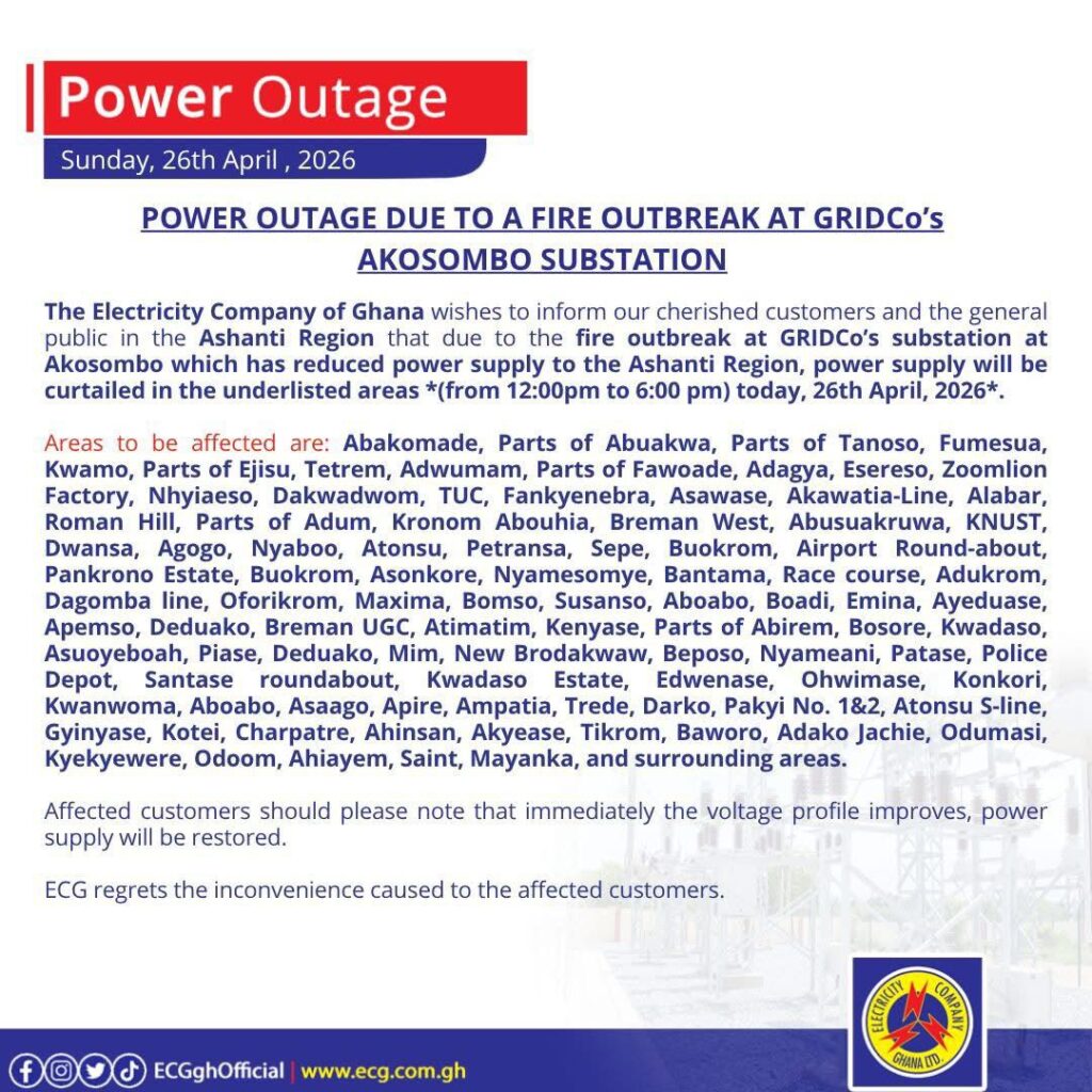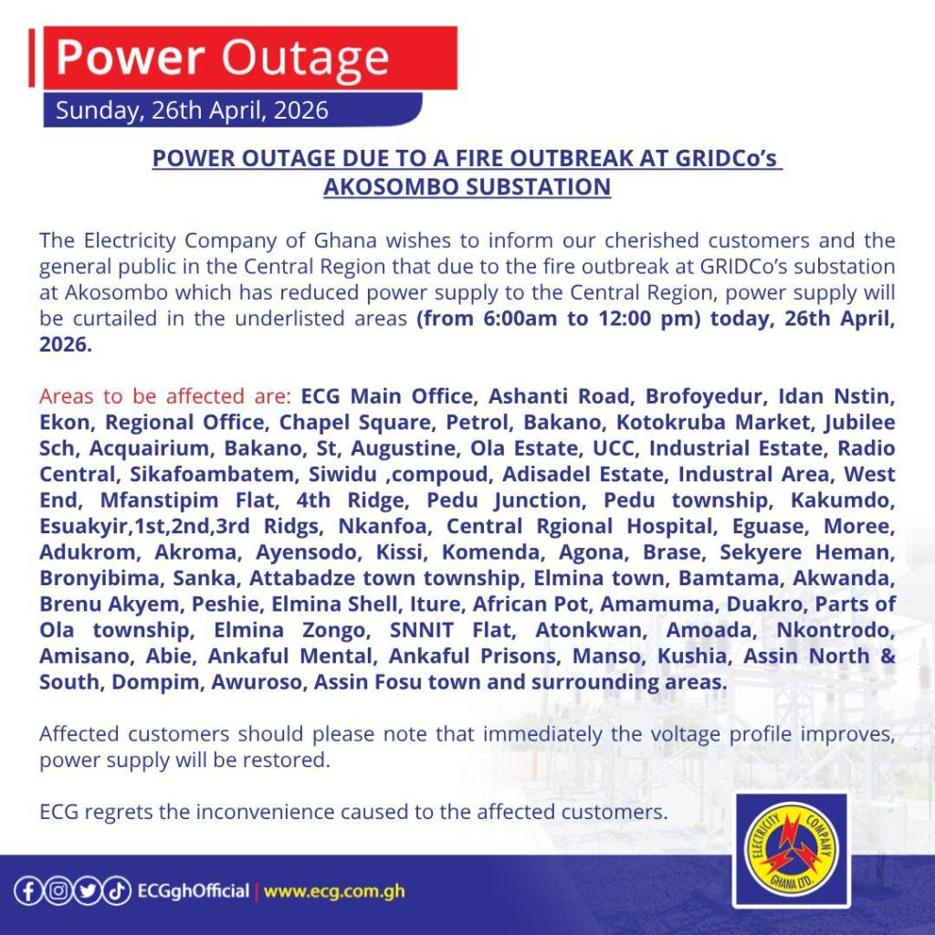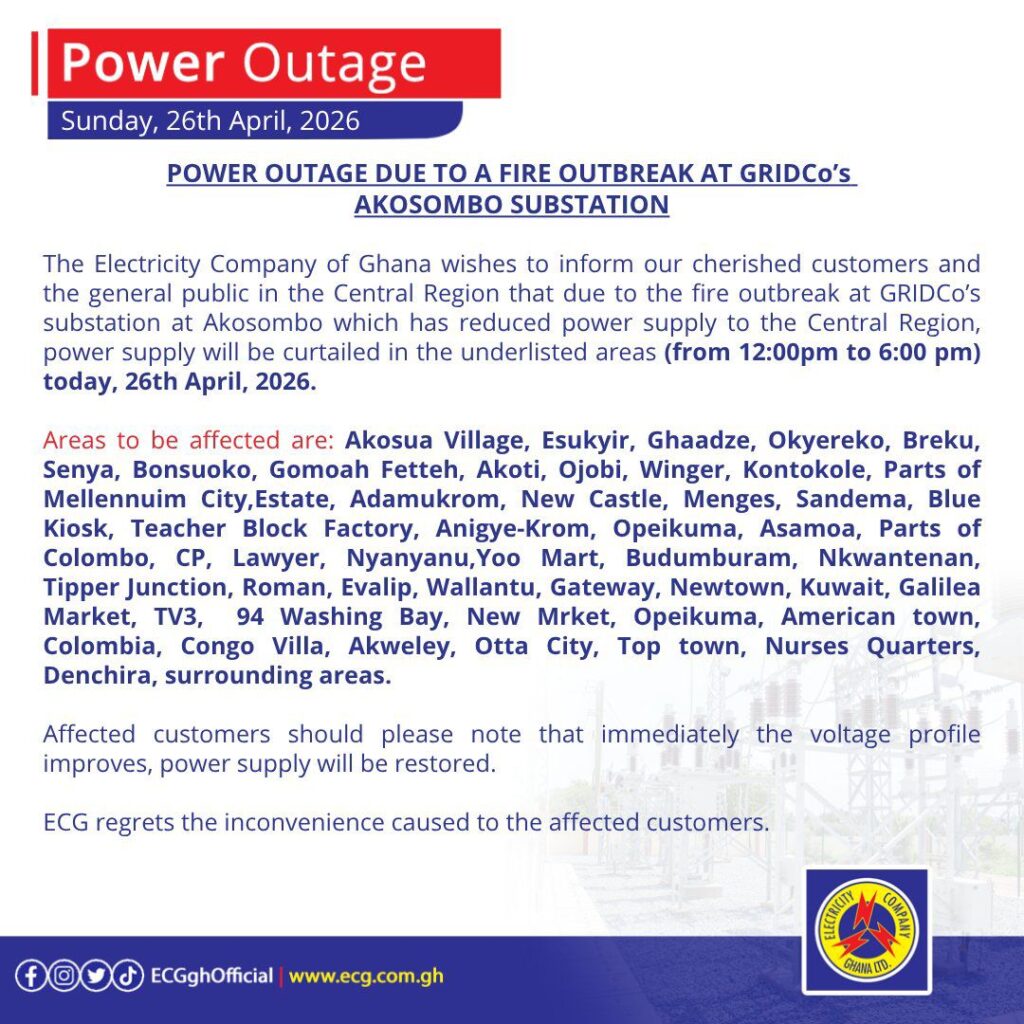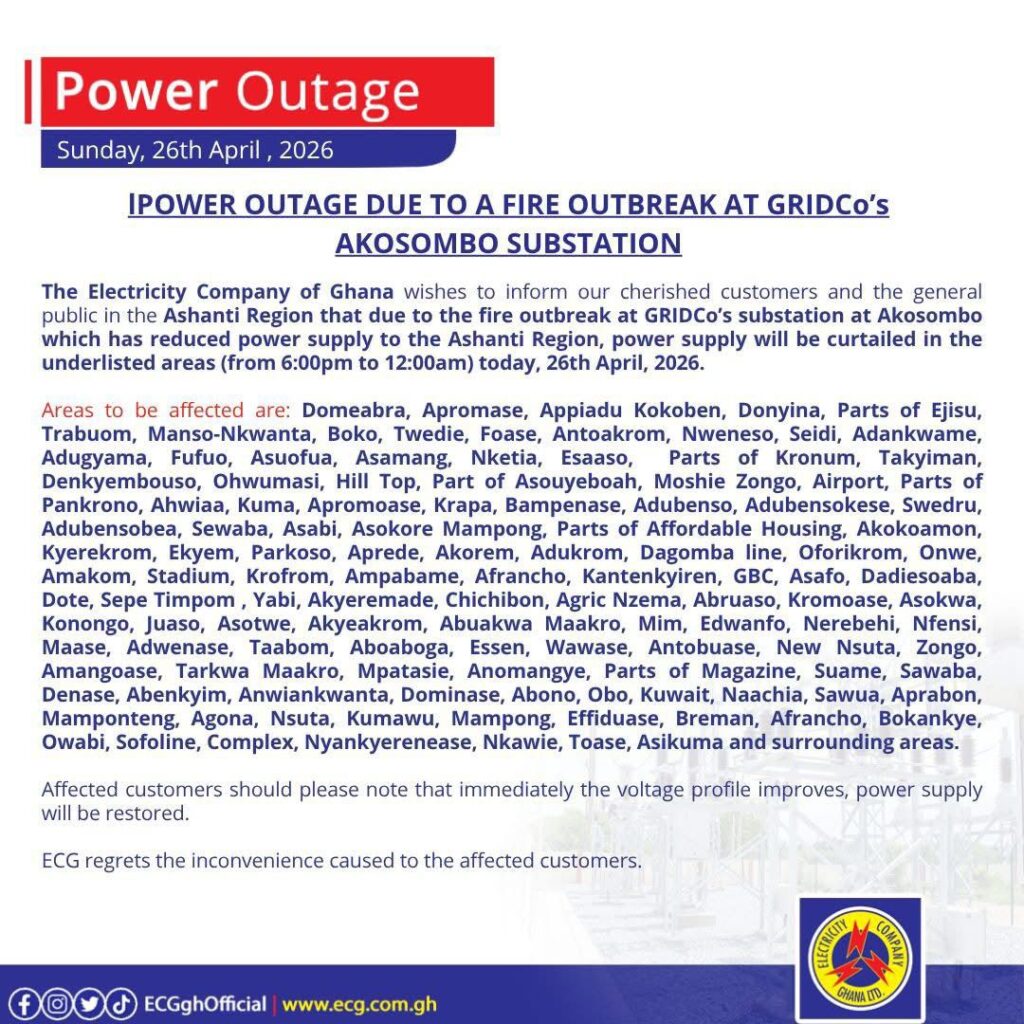 ECG explained that the power cuts are part of efforts to manage the limited supply following the disruption at the Akosombo substation. The company assured customers that electricity would be restored as soon as the voltage profile stabilises.